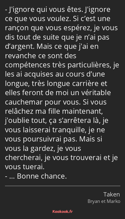 Lors de son exploitation en france, ce film d'action a réalisé plus d'un million d'entrées. Taken telephone j'ignore qui vous êtes. Si vous ne la relâchez pas, je vous chercherai, je vous trouverai et je vous tuerai.