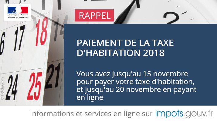 visitez l'article complet ici : https://www.lalsace.fr/actualite/2019/01/08/impots-voici-le-calendrier-des-echeances-2019 La date limite de paiement de la taxe d'habitation 2021 est fixée au lundi 15 novembre 2021 minuit pour les résidences principales, ainsi que pour certaines résidences secondaires. La date limite de paiement de la taxe d'habitation de l'année 2020 est fixée au 15 novembre 2020 pour la résidence principale, ainsi que pour certaines résidences secondaires. Les moyens de paiement possible.
